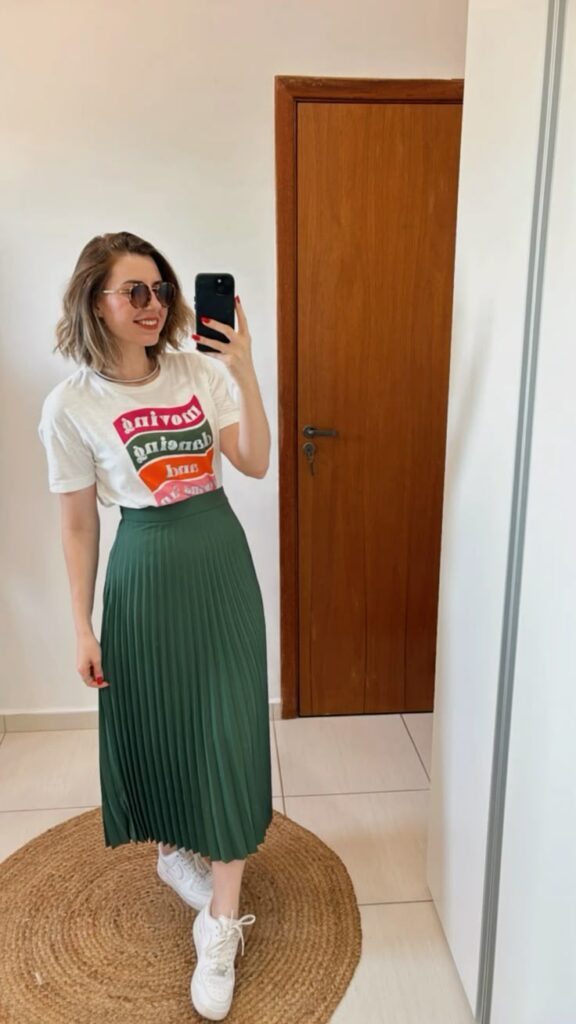 So this combination works because the retro print on the tee and the deep forest green of the skirt are pulling from the same bold energy. White trainers ground everything and stop it from feeling too precious. You ought to tuck the tee loosely at the front only, it is a small detail that makes a big proportion difference and keeps the whole look casual rather than stiff.