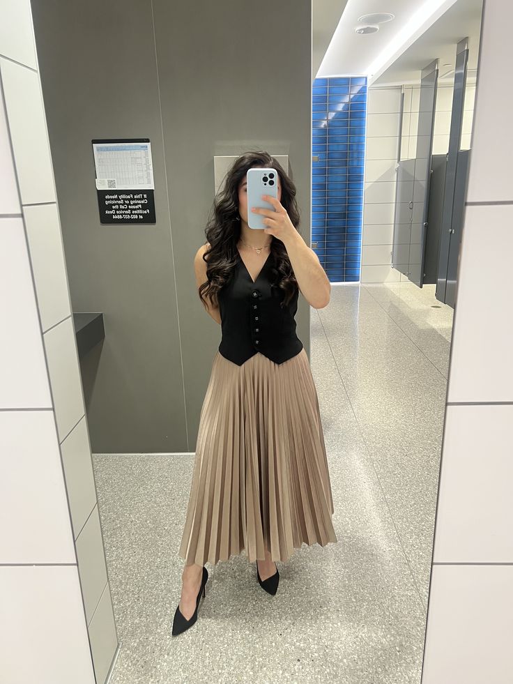 Fitted black waistcoat worn alone over a champagne pleated midi with black pointed pumps is genuinely such an evening appropriate look. The structured waistcoat against the soft fluid pleats creates a beautiful tension between hard and soft. It reads polished and slightly editorial. If you want to wear a pleated skirt somewhere that actually feels dressed up, this is the combination you ought to try.