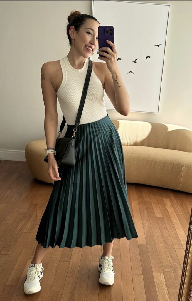 This one is all about that colour contrast and the energy it creates. A fitted cream ribbed halter neck tucked into a deep emerald pleated midi with chunky white trainers and a black crossbody bag is so fresh and so striking. The black bag mirrors the darkness of the green and ties the whole look together. Hair in a bun keeps the neck and neckline clean. So wearable and honestly so cool.