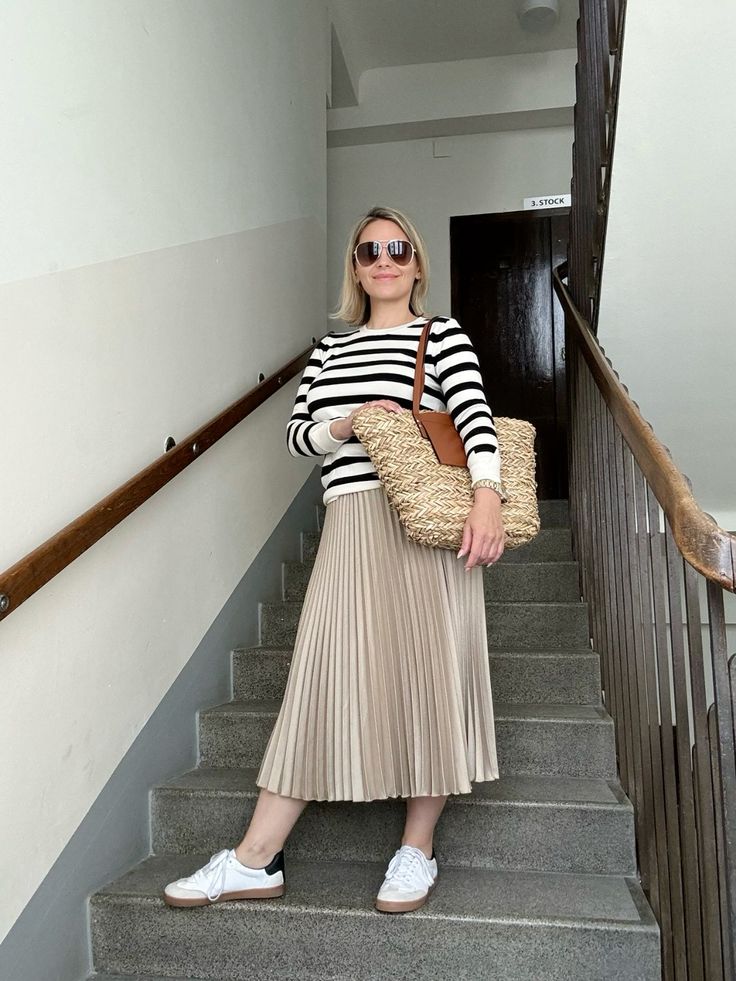A fitted Breton stripe top tucked into a nude pleated midi with white leather trainers and a woven raffia tote is so classically good it almost feels like cheating. The straw bag with leather trim adds texture and warmth that plays beautifully against the cool beige of the skirt. This is one of those combinations that works across every age, every occasion and honestly every season.