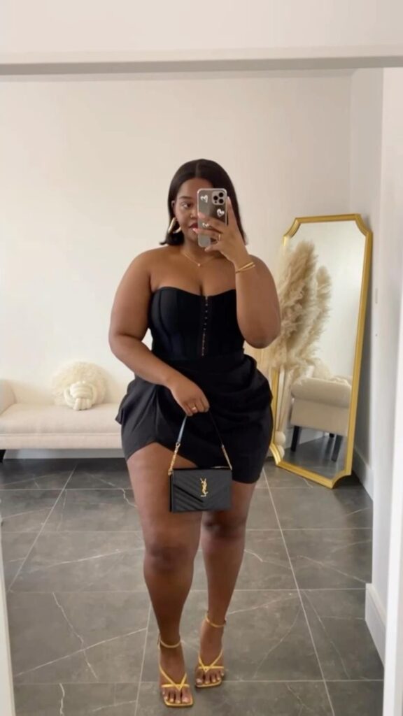 Black corset top paired with a tulip skirt, gold strappy heels and an iconic black crossbody is such a clean and considered birthday look. The corset boning creates definition without anything feeling restrictive and the gold heel tone ties directly into the bag hardware. I mean this is genuinely one of the most polished plus size birthday outfits on this whole list. Understated but completely intentional.
