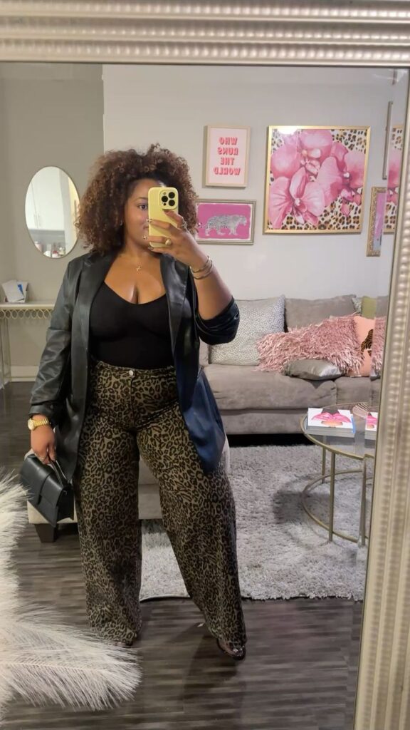 Wide leg leopard print trousers with a black cami underneath a leather blazer is such a confident plus size birthday outfit for a dinner or evening out that is not quite a nightclub. The black structured bag adds polish without being too formal. You know you ought to wear animal print more often if you have been playing it safe, so let your birthday be the excuse you needed.
