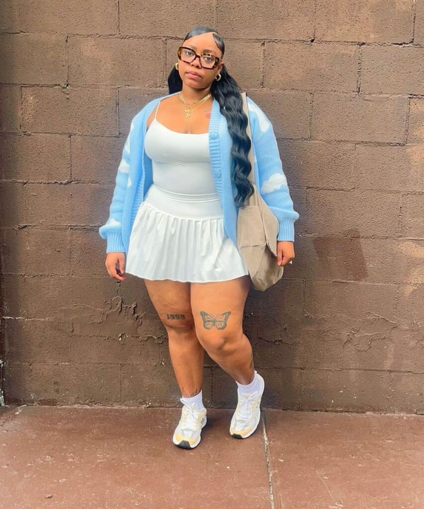 The white floral applique cardigan over a blush pink tulle maxi is so dreamy and completely committed to its cottagecore princess moment. The quilted pink bag and white sneakers bring it back to something wearable and real rather than costume territory. You ought to add a bow hair clip and some pearl earrings for the full effect. This is the plus size birthday outfit for the romantic who wants the photos to look like a fairy tale.