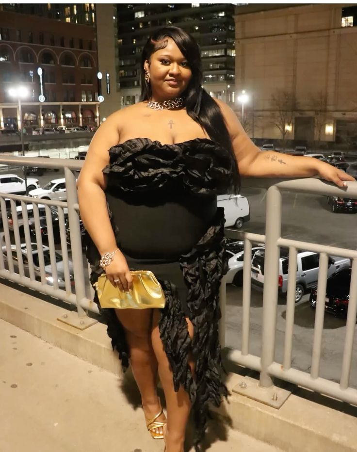 That strapless black ruffled asymmetric dress paired with gold strappy heels and a gold clutch is proof that monochrome plus size birthday outfits can absolutely go big on texture and drama simultaneously. The ruffle detailing creates movement that photographs so well outdoors at night. Stack your wrist with bracelets and let the gold accessories carry the colour story so the look never feels flat.