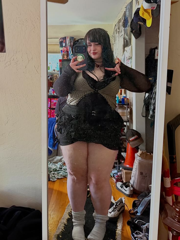 Layering a sheer mesh long sleeve under a knit cami with a tiered black ruffle mini and chunky white sneakers is such a cool plus size birthday outfit for someone who has their own aesthetic and refuses to compromise it for anyone. The choker and layered necklaces add detail without competing. So if your birthday vibe is more moody vintage than going out glam, this is basically your blueprint.