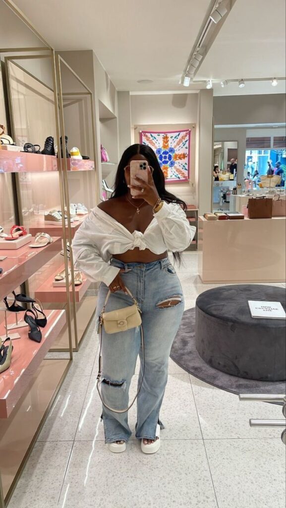 Knotting an oversized white shirt at the bust while styling it with wide distressed jeans and a cream saddle bag is the plus size birthday outfit for someone who knows that looking good does not have to mean looking dressed up. The off shoulder slouch of the shirt creates effortless cool and the white platform sandals finish everything cleanly. This is genuinely the daytime birthday shopping look done perfectly.