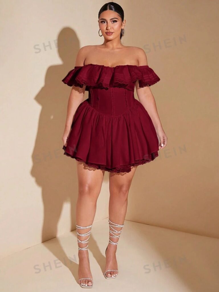The off shoulder ruffle corset romper in deep burgundy with lace trim and crystal wrap heels is such a beautifully considered plus size birthday outfit. The corset waist detail creates an incredible silhouette and the ruffled neckline frames everything so well. Hoop earrings and a sleek updo let the dress work without any competition. This is giving romantic birthday dinner energy from every single angle.