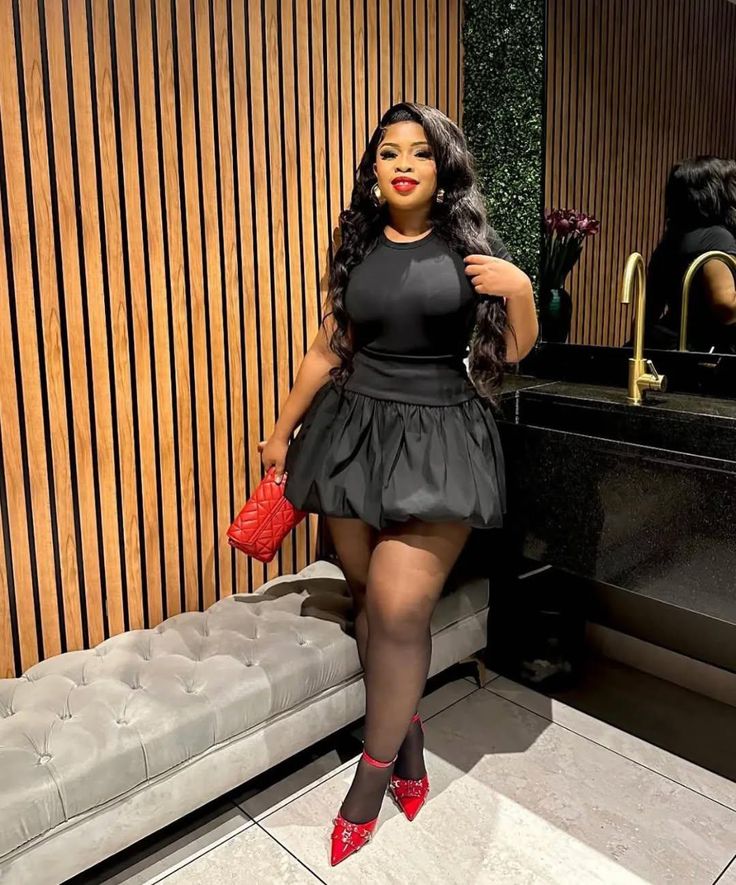 An all black puff skirt mini with a fitted round neck top is already such a solid plus size birthday look, but honestly it is those red embellished pointed heels and the matching red quilted bag that make this extraordinary. Red accessories against all black is one of those combinations that looks intentional every single time. So if you want to wear something classic but land as the most stylish person in the room, this is how you do it.