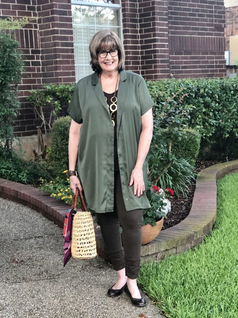 An olive longline button shirt worn open over a black cami with matching olive skinnies and black flats with a woven basket bag is such a cool tonal dressing approach.