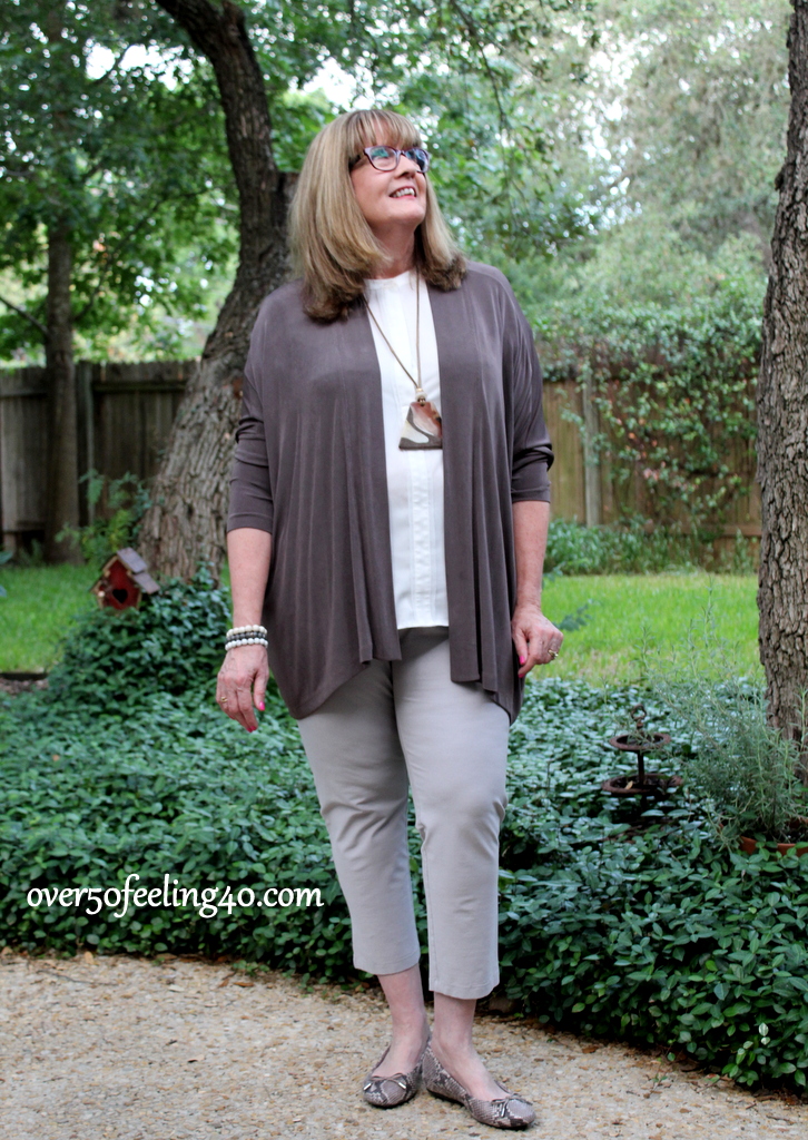 A taupe flyaway cardigan over a white linen top with grey cropped trousers, snake print flats and a statement pendant necklace is one of those outfits that proves neutrals can be genuinely interesting.