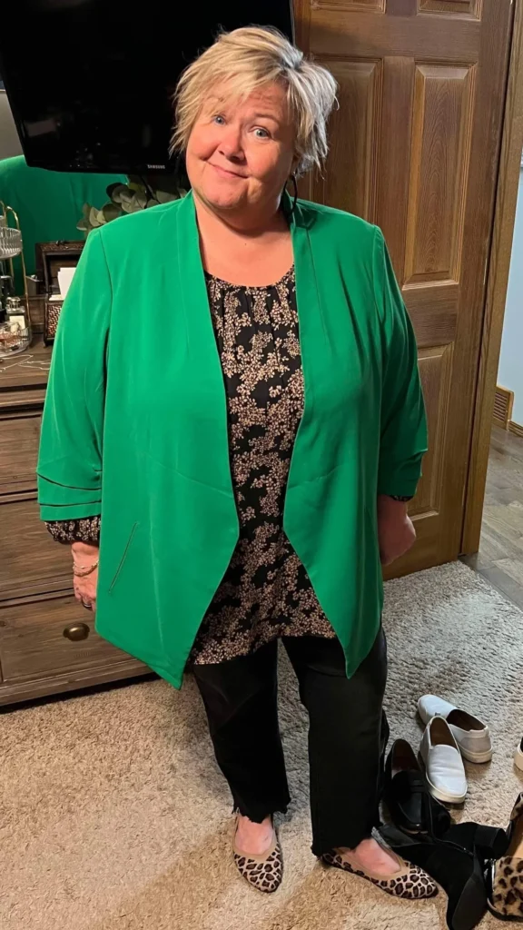 Listen, a bold kelly green blazer over a floral blouse with dark straight trousers and leopard print flats is the kind of outfit that makes a room notice you.