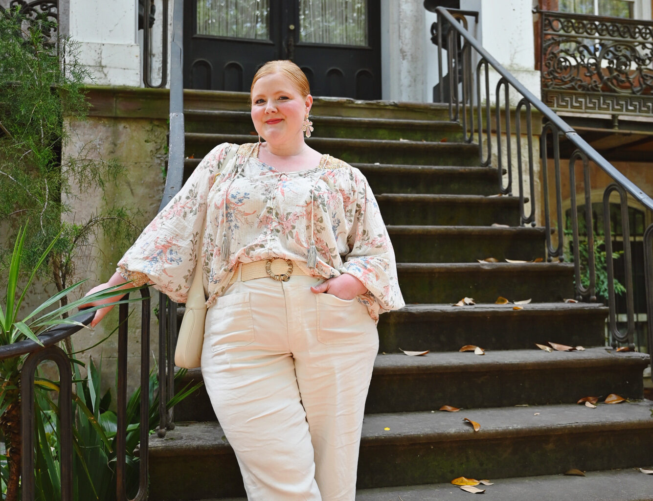 The all cream palette feels fresh and modern while the blouse detail adds that feminine flair.