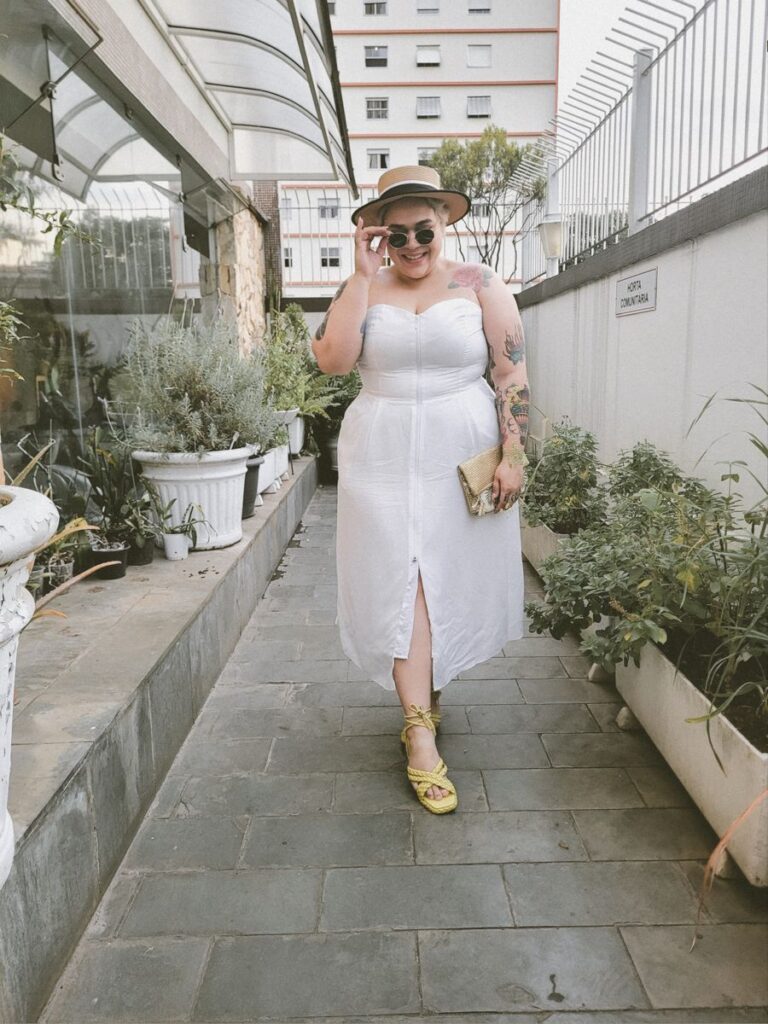 A white strapless midi dress with front button detail and a boater hat, round sunnies and yellow lace up block heeled sandals is such a confident and joyful summer outfit.