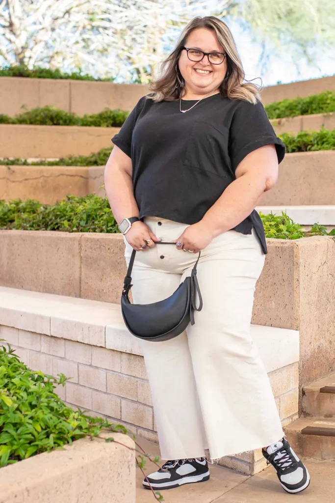 A black boxy tee tucked slightly into cream wide leg jeans with a black crescent crossbody bag and chunky sneakers is genuinely the most versatile casual formula in the lineup.