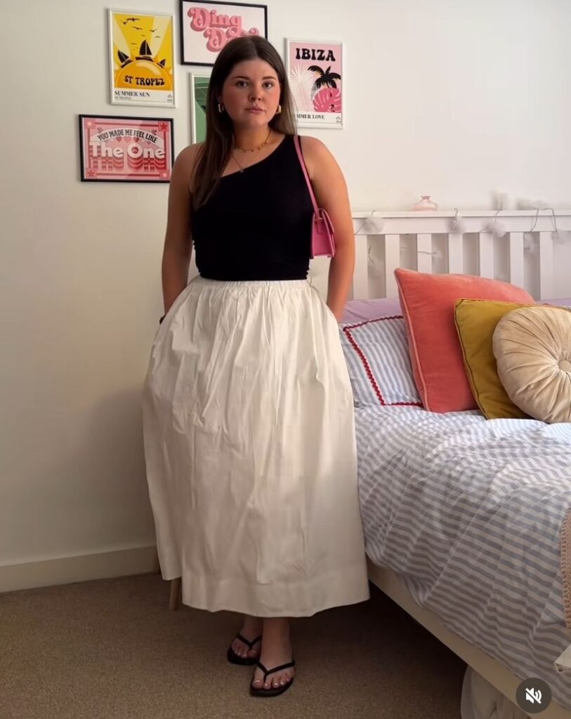 For the girl who wants to look effortless on a summer day out, a black asymmetric tank over a white poplin midi with a pink mini bag is genuinely all you need.