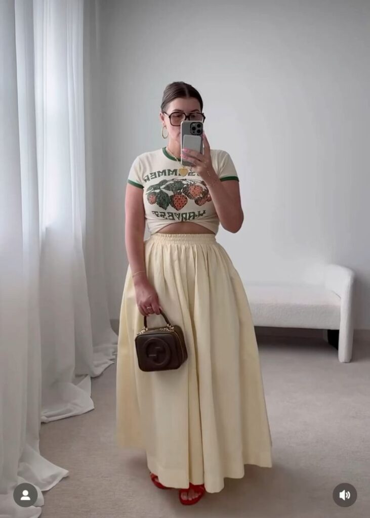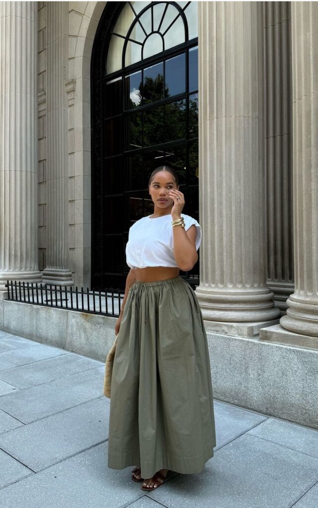 The white boxy crop tee tucked into a sage green gathered poplin maxi with a tan basket bag and gold bangles stacked on the wrist is genuinely beautiful.
