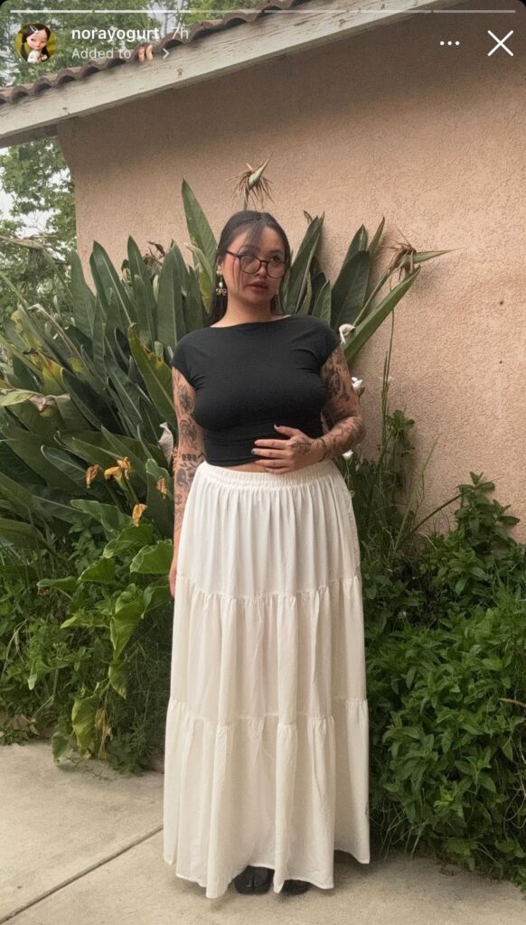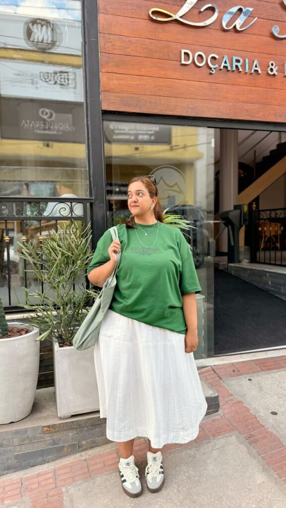 This works so well on curvier body types because the full skirt creates beautiful balance below while the oversized tee stays comfortable and unbothered on top.