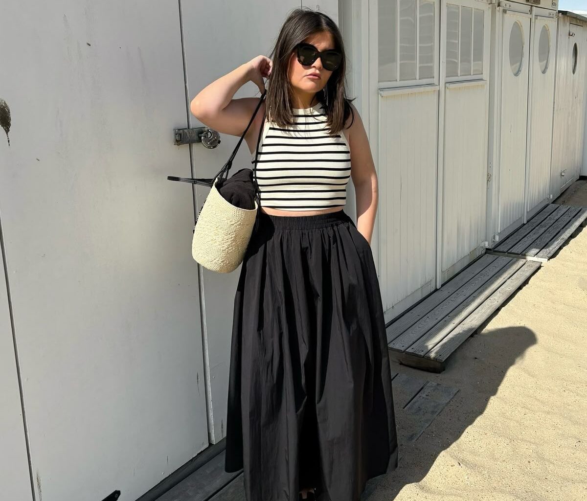A cropped Breton stripe tank paired with a full black poplin maxi, black strappy sandals and a woven basket bag at the beach is giving effortless coastal style that nobody can argue with.