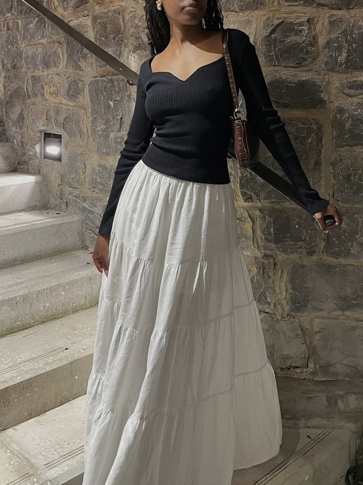 The scalloped sweetheart neckline on that black ribbed top with the white tiered poplin maxi next to a stone staircase is giving understated European romance and I am completely here for it.