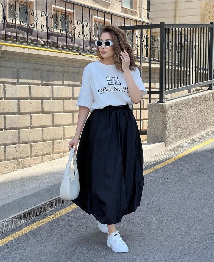 White oversized logo tee tucked loosely into a black gathered poplin midi with white sneakers and a white structured bag.