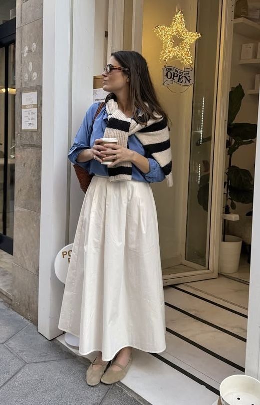 Layering a chunky black and cream striped knit scarf loosely over a chambray button down shirt worn with a white poplin midi and ballet flats outside a coffee shop is such a good transitional season move.