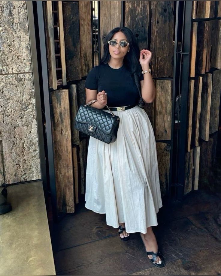 The monochrome pop of white accessories against black skirt is clean and considered. Honestly the full skirt in black is such a good alternative to the usual white version and it reads more polished without trying harder.
