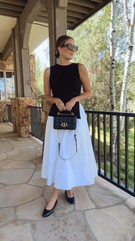 The ribbed black sleeveless top tucked into a full white poplin midi with patent black ballet flats and a quilted chain bag hits the exact right note between dressed up and effortless.