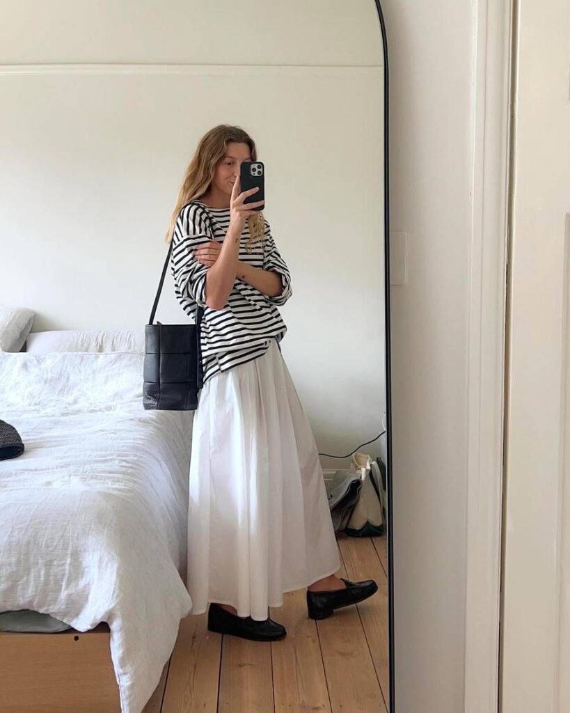 Oversized Breton stripe long sleeve tucked loosely at the front into a white poplin maxi with black loafers and a structured black crossbody.