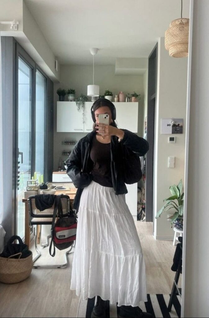 A dark brown tank under an oversized leather jacket over a white tiered poplin maxi with chunky black ankle boots and headphones on.