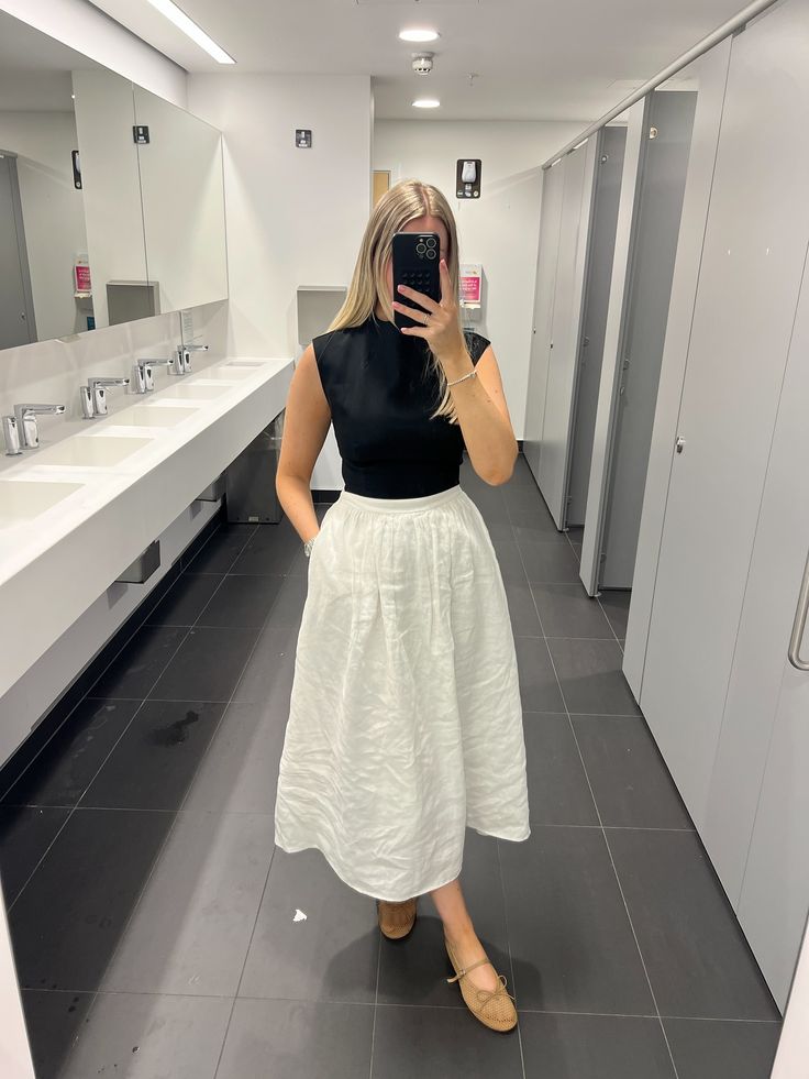 A fitted white ribbed tee tucked into a soft greige gathered poplin skirt with flip flops, oversized sunglasses and a black tote slung over the shoulder is giving quiet luxury without the price tag.