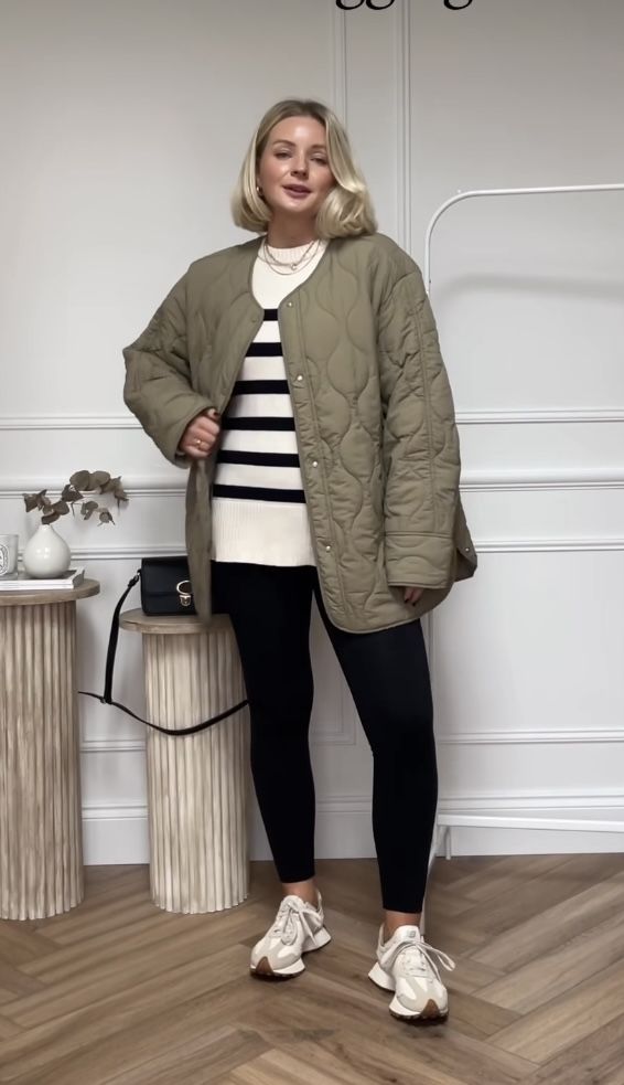 Pairing a striped knit underneath an open olive quilted jacket with black leggings and fresh trainers is one of those combinations that somehow manages to feel both sporty and put together at the same time. The layered gold necklaces are such a nice touch. You ought to try this one on a weekend morning when you need to look presentable but refuse to give up comfort.