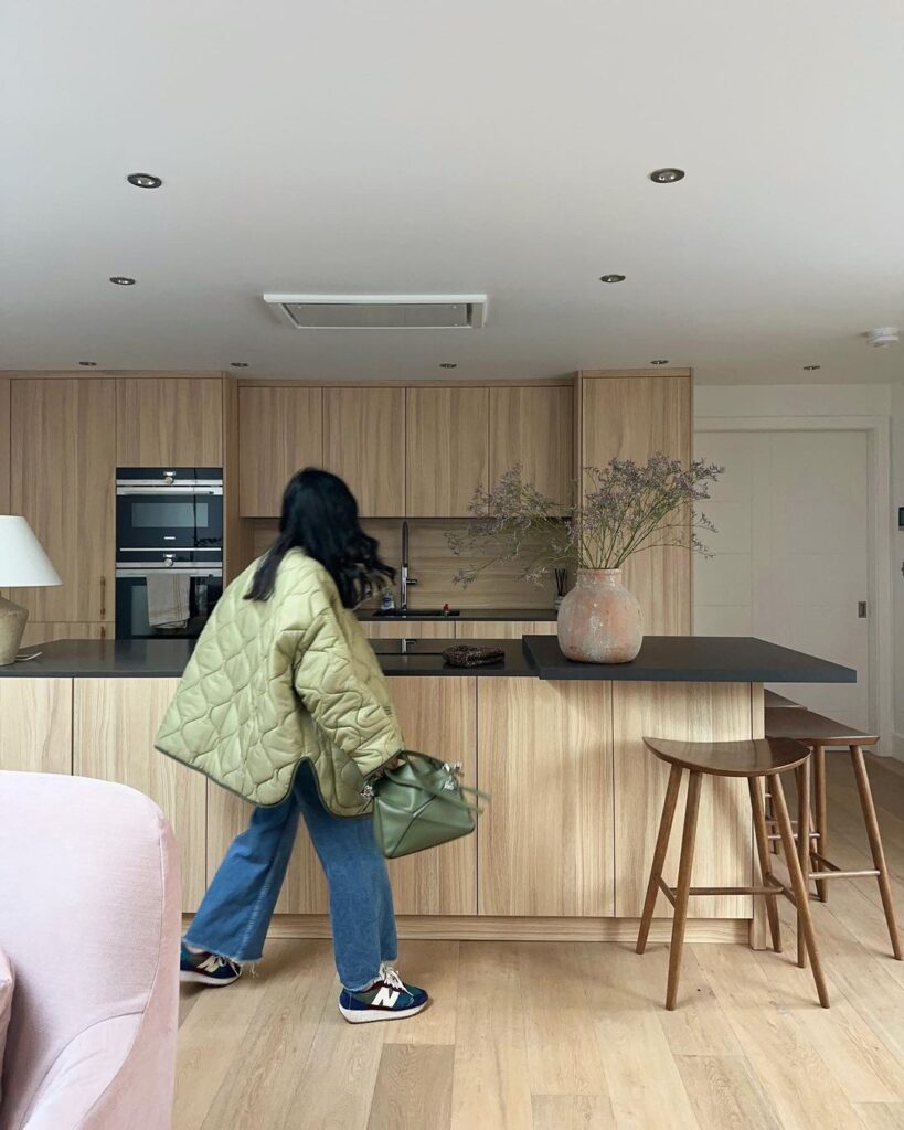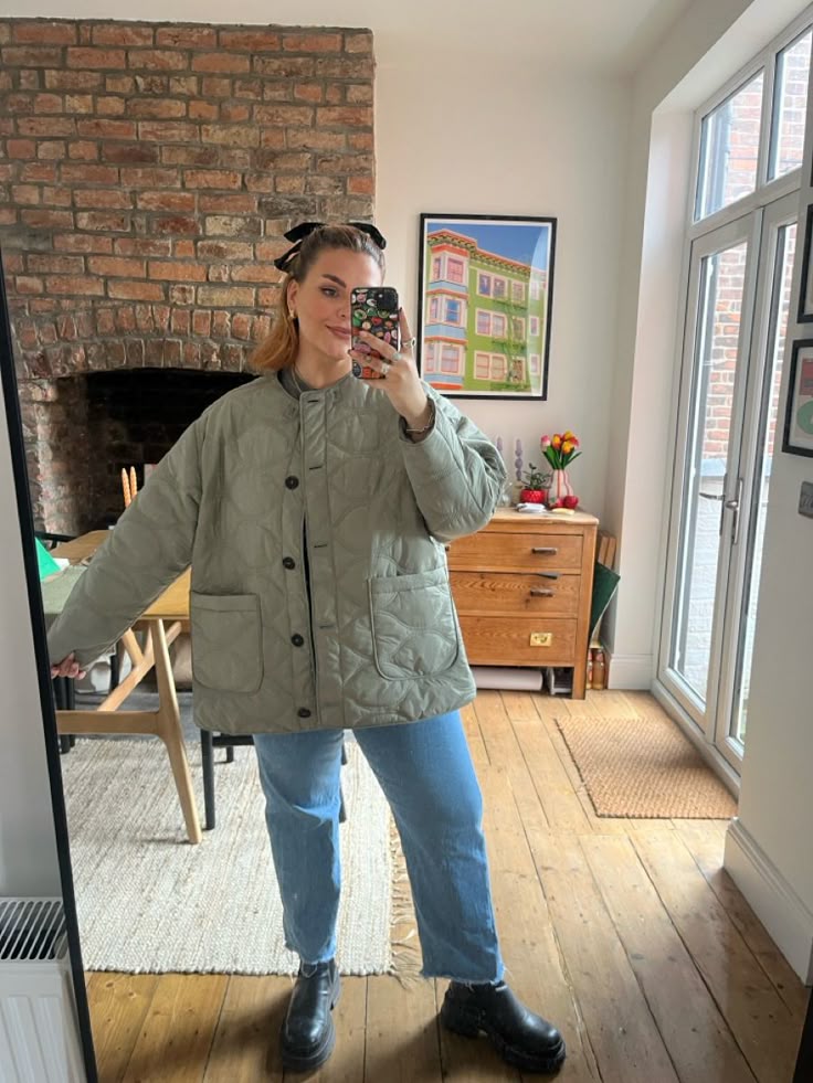 Chunky black boots with an oversized sage quilted jacket and straight leg jeans? So good. The loose silhouette of the jacket does all the heavy lifting here so you really do not need to overthink the rest. Keep accessories minimal. The bow detail in the hair ties the whole thing together in the most effortless way.