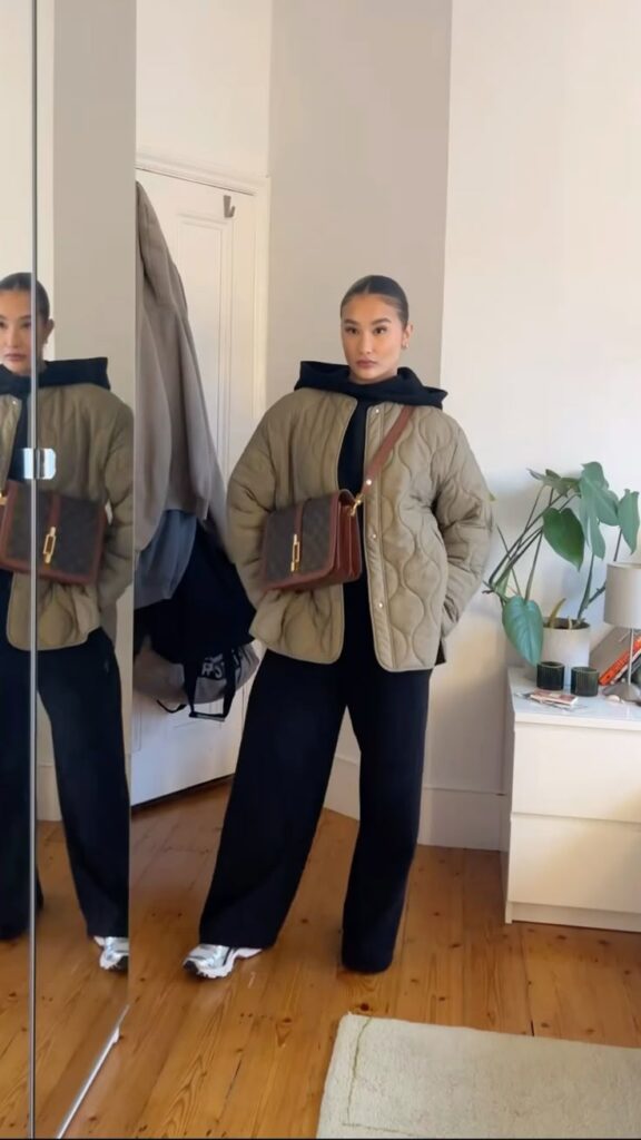 Layering a black hoodie underneath an olive quilted jacket is one of those combinations that just works every single time. The rich brown shoulder bag adds a warmth that stops the look from feeling too casual. Wide black trousers and chunky trainers round it out into something that feels really considered. I mean it looks like a fashion week off duty moment but with zero effort involved.