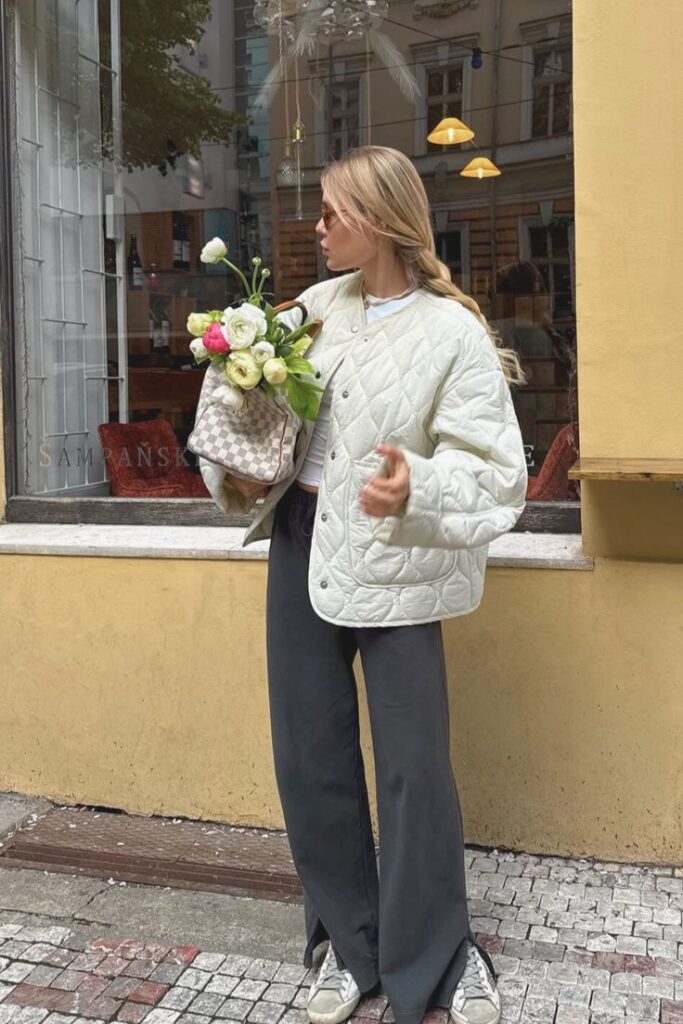 There is something so genuinely lovely about a cream quilted jacket worn with charcoal wide trousers and a checkerboard bag full of fresh flowers. The white cropped tee underneath keeps it light and the contrast with the darker trousers grounds the look. This is basically the ideal Saturday morning outfit and you know it.