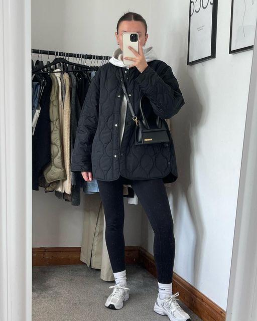 This all black outfit with a black quilted jacket over a hoodie, leggings, and white trainer socks is so clean it hurts. The micro bag is doing a lot of heavy lifting in terms of style. White chunky trainers stop it from feeling too heavy. This is for anyone who basically lives in black and wants a quilted jacket to fit seamlessly into their existing wardrobe without disrupting anything.