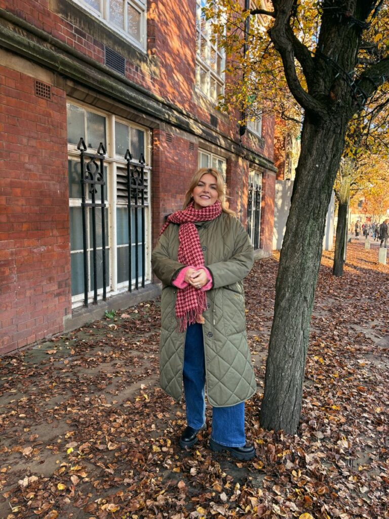 The pop of pink and red houndstooth scarf against an oversized khaki longline quilted coat is genuinely inspired. It keeps the outfit from feeling too serious and gives it real personality without trying too hard. Wide leg jeans and black chunky boots bring the weight down and balance all that volume on top. This is autumn dressing done properly.