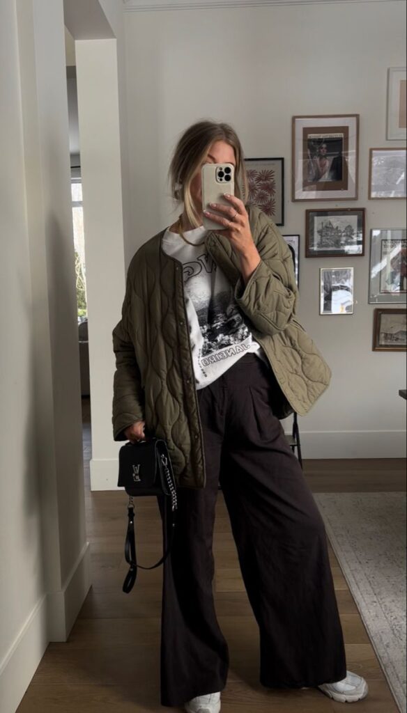 Throwing an olive quilted jacket over a vintage graphic tee and chocolate wide leg trousers is such an easy formula that looks like so much more than the sum of its parts. The dark tones in the trousers ground everything and the white trainers stop it from feeling too heavy. This combo works whether you are running errands or heading somewhere casual.