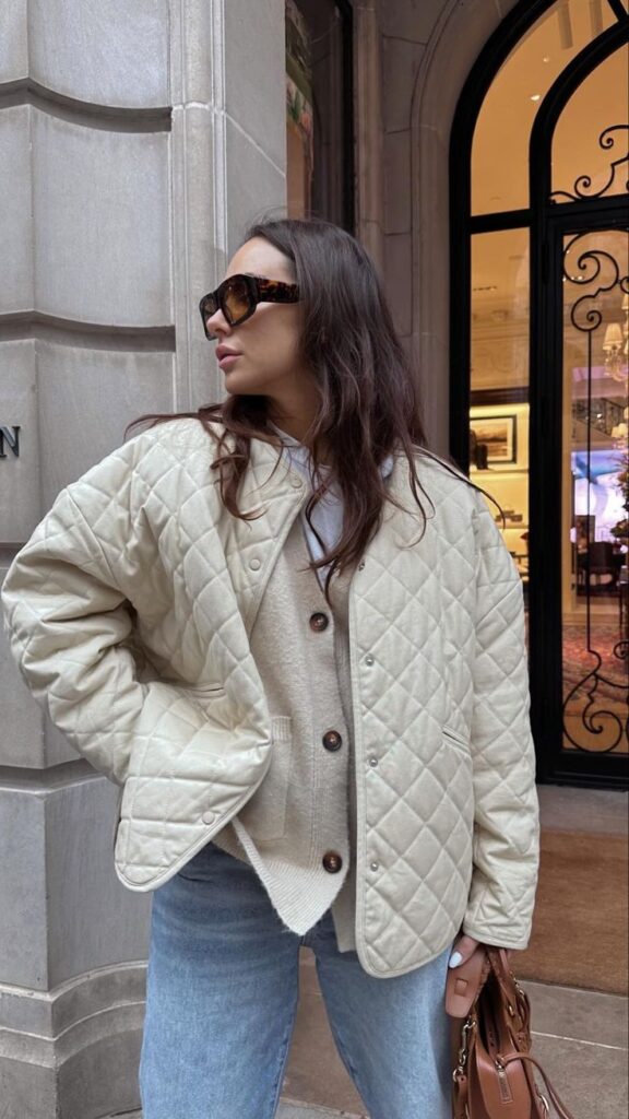 Stacking a knit cardigan underneath a cream quilted jacket is such a clever way to add dimension to a neutral look. The tortoiseshell sunglasses do more work than you would think, giving the whole thing a polished city feel. Pale jeans and a cognac bag keep it warm toned and balanced. Honestly this is the kind of outfit you see in Paris and immediately screenshot.