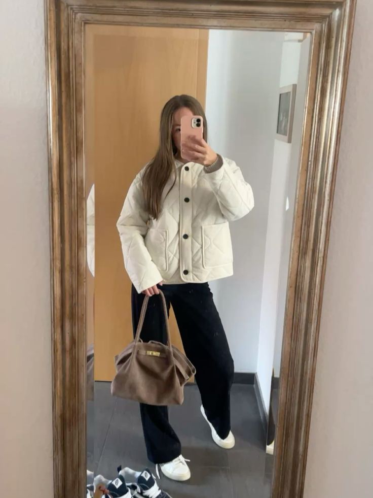 This all cream and ivory situation works because the textures are doing the work. The quilted jacket layered over a chunky knit with dark trousers underneath stops it from feeling flat. White trainers ground it without adding another colour into the mix. It is cosy without looking like you just threw things on, which honestly takes more skill than people realise.