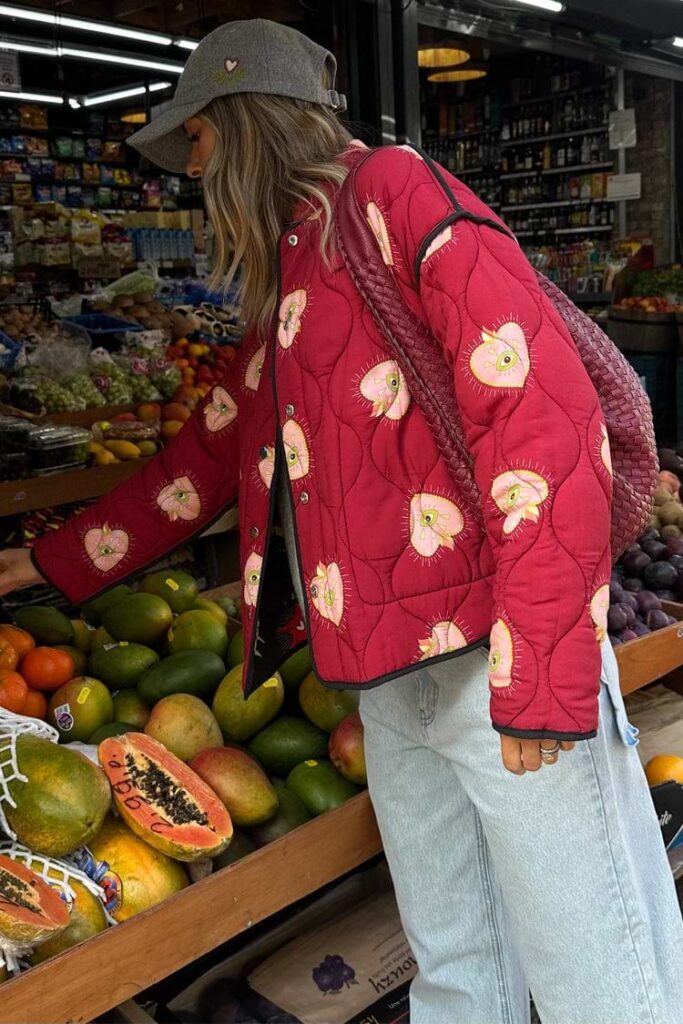This bold red quilted jacket covered in illustrated heart motifs is basically a statement all on its own. Honestly just pair it with simple wide leg jeans and a cap and let the jacket do the talking. The woven burgundy bag picks up the red beautifully without competing. For anyone who finds plain outfits boring, this is your answer.
