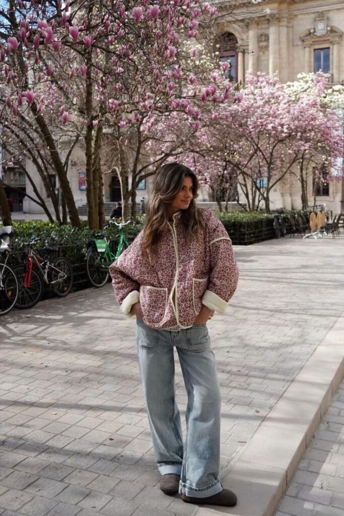 The floral printed quilted jacket with cream sherpa trim is so much more interesting than a plain one and it works because the print feels vintage rather than loud. Worn with washed wide leg jeans and textured slip on shoes, the whole thing reads like effortless spring dressing. This is the kind of jacket that makes people stop you on the street to ask where it is from.