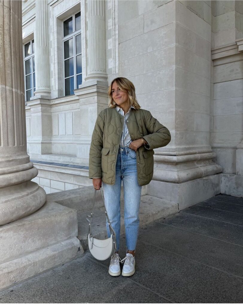 Layering a striped shirt underneath an olive quilted jacket is such a smart move for transitional weather. The light wash jeans keep everything feeling fresh and the white trainers make it feel current without being try hard. Okayyy this is basically the blueprint for looking stylish on a low effort day. The crescent bag is the perfect finishing touch.
