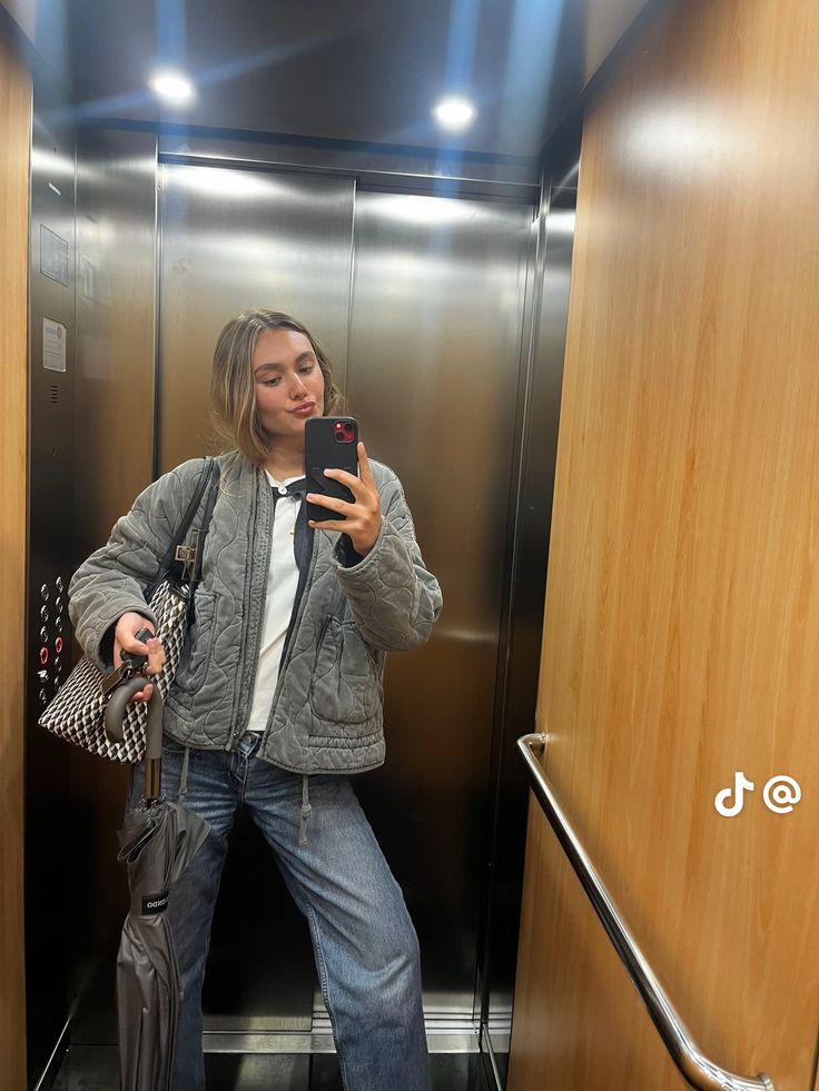 Travel outfits usually go one of two ways and this one absolutely nails it. The grey quilted bomber with straight jeans and a printed tote is relaxed but not sloppy. Throwing this kind of jacket over a simple white tee for a flight or a train journey means you arrive looking like you did not just sit in a seat for four hours. A genuinely underrated approach to travel dressing.
