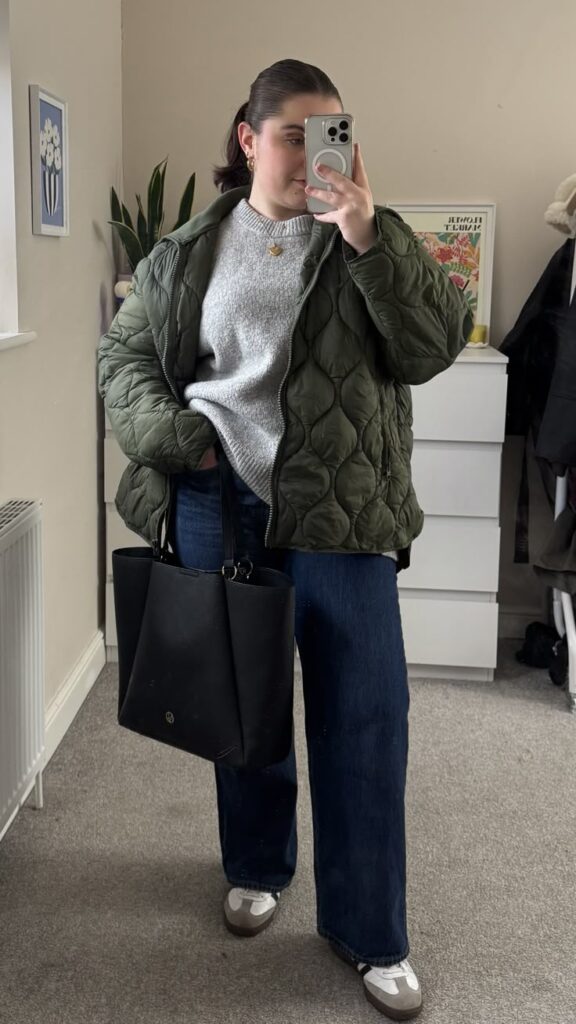 Dark wash wide leg jeans with a deep olive quilted jacket and a grey marl knit peeking out underneath? This is so wearable for literally anyone. The mix of textures between the knit and the quilted fabric is what makes it feel elevated. Chunky trainers keep it relaxed and the oversized tote means you are actually ready for a full day out.