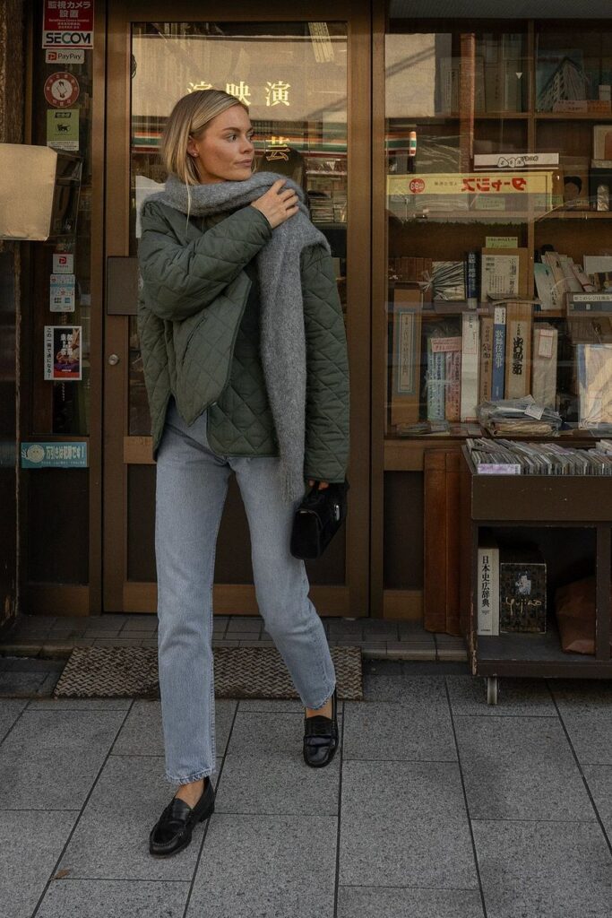 The grey quilted jacket with a giant oversized scarf wrapped around it, light wash jeans and black loafers just looks like a whole mood. It is that effortlessly cool thing where you cannot quite put your finger on why it works so well, it just does. The setting outside a Japanese bookshop helps but honestly this outfit would look just as good anywhere.