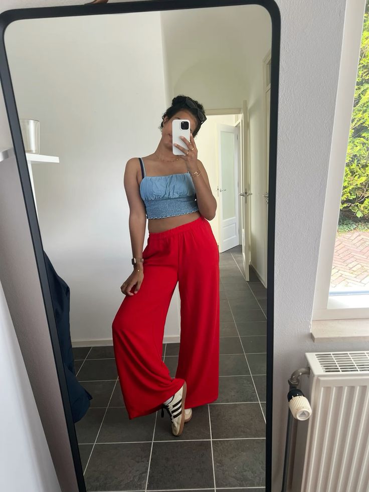 Okayyy, so the light wash denim smocked crop top paired with flowing red wide leg trousers and vintage Adidas Sambas is genuinely such a fresh combination. The cool blue of the denim against that warm red creates such a good contrast without clashing. Pull your hair up to show off the neckline of the top and you are sorted. This is the kind of outfit that feels very personal and very wearable at the same time.