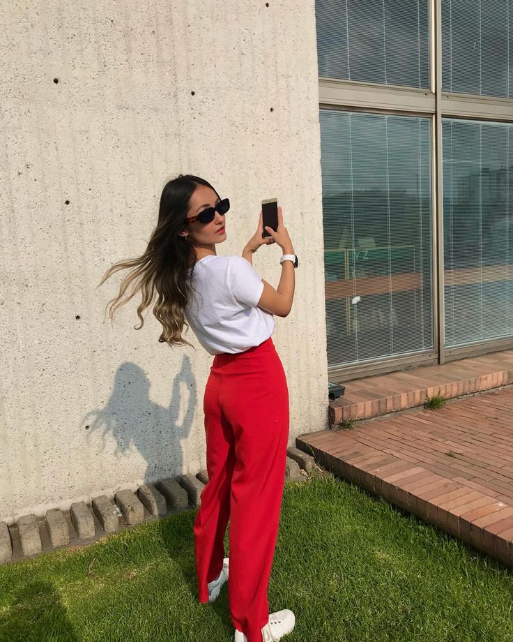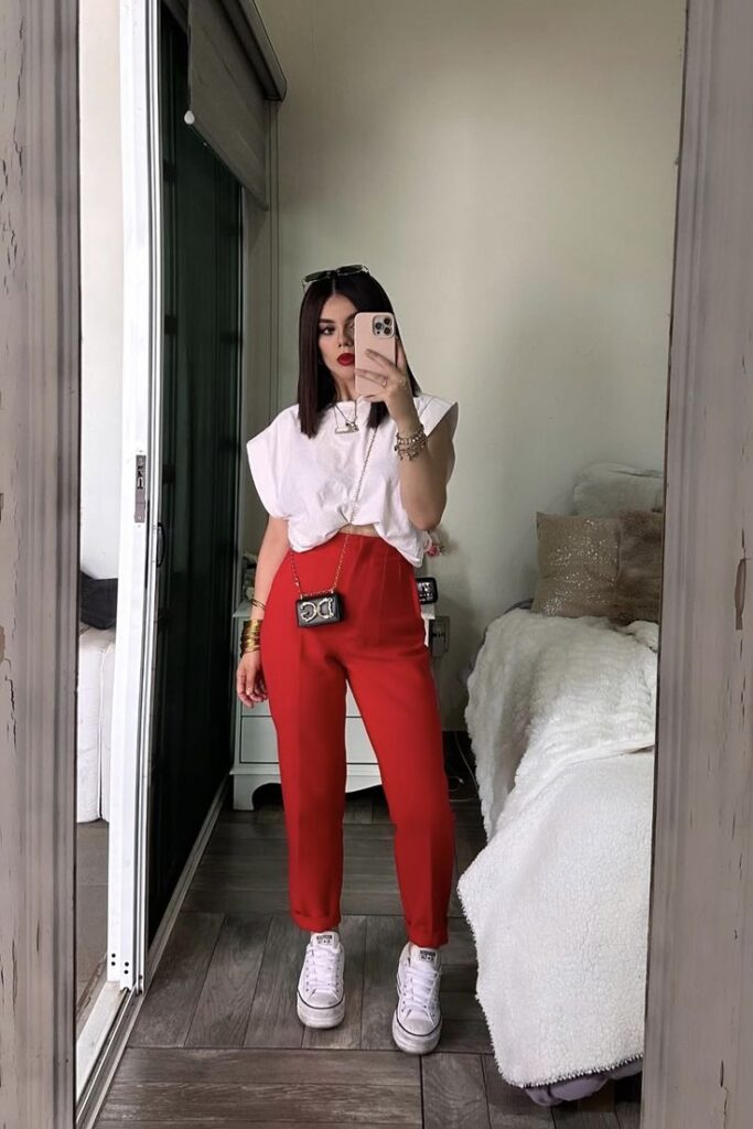 Knotting your white tee at the waist before tucking it into high waist red trousers is a small move that creates a huge proportion shift. It shows the waistband, adds a little midriff moment and generally makes the whole look feel more deliberate. The black hardware micro bag worn as a crossbody and the stacked gold bracelets keep it looking polished. White Converse seal the deal on the casual cool factor.