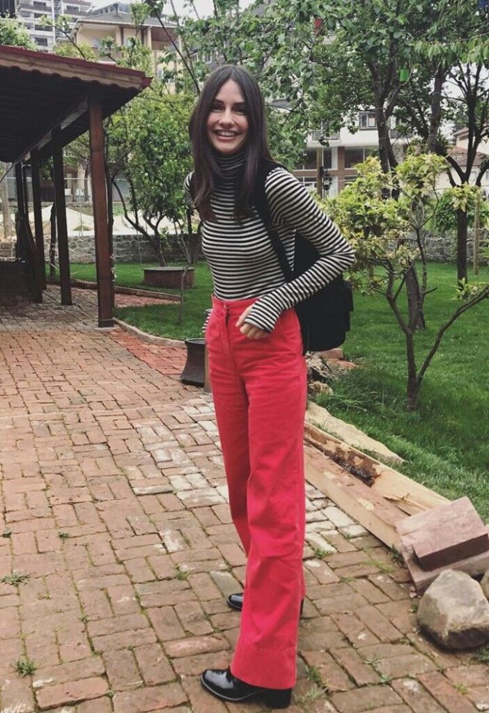 This combination gives such strong vintage energy in the best possible way. A fitted black and white stripe turtleneck with wide red corduroy flares and black patent loafers feels like it was pulled from a French fashion archive. It works beautifully for cooler weather when you want colour but also warmth. The black backpack keeps it casual enough for everyday. Genuinely one of the most stylish outfits in this guide.