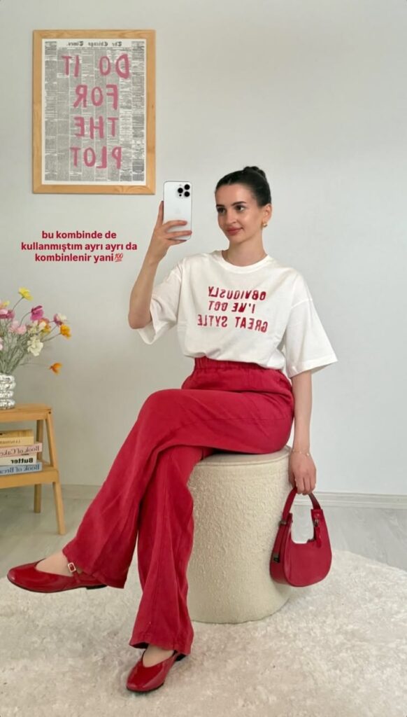 White graphic tee, red wide leg trousers, red patent mary janes and a red mini bag. Basically this person committed to a colour story and it paid off completely. The white tee gives the eye somewhere to rest in all that red, which is exactly why it works. You ought to try matching your bag and shoes to your trousers if you want to look very intentional without overthinking every piece. So chic and so easy.