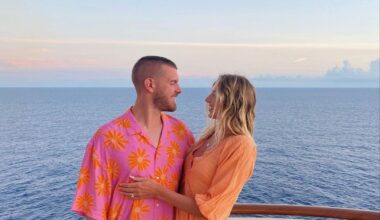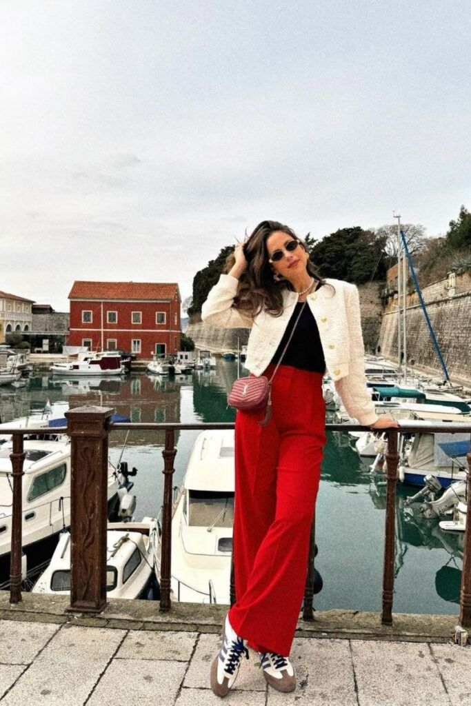 The cropped cream tweed jacket with gold buttons over a black top and wide red trousers with a red YSL bag and retro trainers is giving so much. The location helps but the outfit would stand anywhere. Pearl necklace layered with the chain details, oval sunglasses, the combination of polished jacket with casual shoes is what makes it feel modern rather than stuffy. This is the travel outfit that earns compliments.